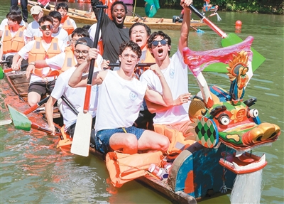 去年,我參加了由杭州余杭區(qū)五常街道組織的龍舟體驗(yàn)營,親身感受競渡帶來的“速度與激情”。我和同校好友組成隊(duì)伍,伴著耳邊觀眾的熱情歡呼揮槳出發(fā),濺起的水花在河道綻放。握槳、入水、拉水、出水、回槳……隨著龍舟劃至終點(diǎn),我們揮舞校旗、舉槳?dú)g呼。在龍舟運(yùn)動(dòng)中,我感受到了奮斗和團(tuán)結(jié)的力量——不同膚色的人們?cè)谕粭l水道上并肩奮進(jìn),這不正是“同舟共濟(jì)”的東方智慧嗎!
