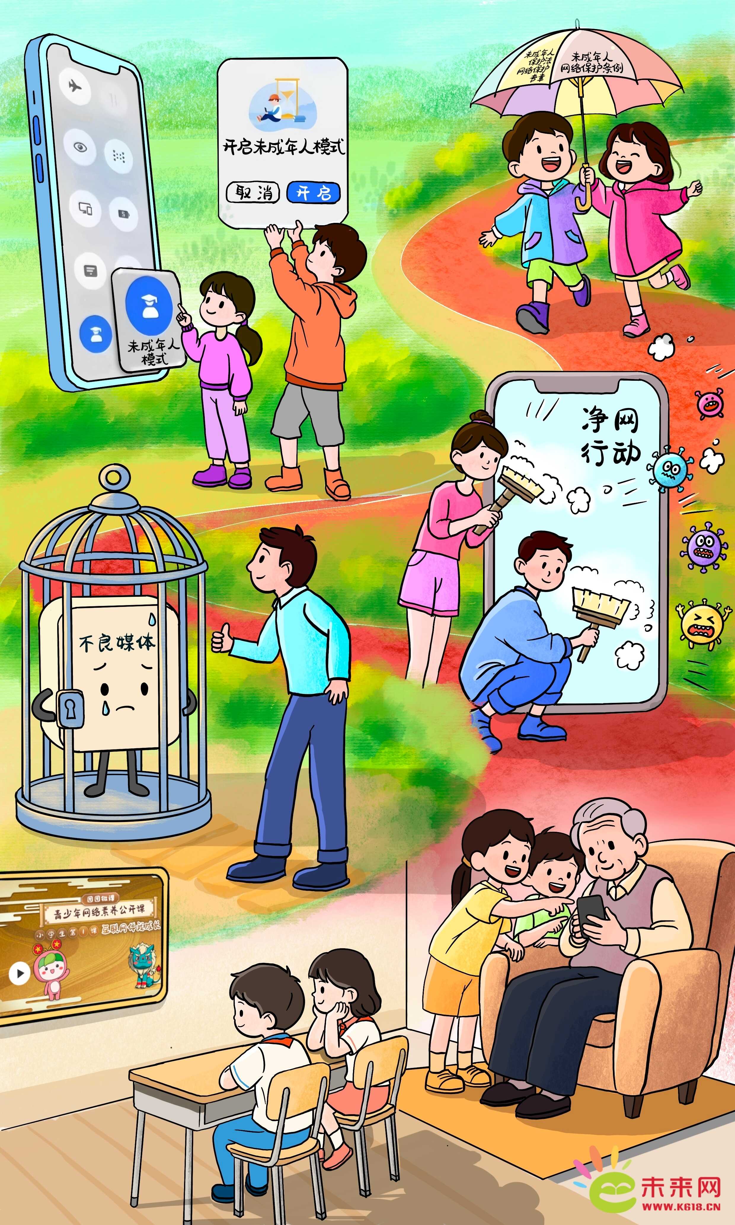 從新修訂的《中華人民共和國(guó)未成年人保護(hù)法》新增“網(wǎng)絡(luò)保護(hù)”專章,到《關(guān)于依法懲治網(wǎng)絡(luò)暴力違法犯罪的指導(dǎo)意見(jiàn)》《未成年人網(wǎng)絡(luò)保護(hù)條例》出臺(tái),我國(guó)從立法、執(zhí)法、司法等多方面不斷織密未成年人用網(wǎng)的法治防護(hù)網(wǎng);中央網(wǎng)信辦持續(xù)開(kāi)展“清朗”系列專項(xiàng)行動(dòng)、發(fā)布《移動(dòng)互聯(lián)網(wǎng)未成年人模式建設(shè)指南》,各地少先隊(duì)組織構(gòu)建貫穿各級(jí)少工委、聯(lián)動(dòng)報(bào)刊網(wǎng)端微屏?xí)纳傧汝?duì)全媒體矩陣,《團(tuán)團(tuán)微課:青少年網(wǎng)絡(luò)素養(yǎng)公開(kāi)課》助力提升孩子們的網(wǎng)絡(luò)素養(yǎng)……全社會(huì)匯聚起守護(hù)清朗網(wǎng)絡(luò)環(huán)境的合力,廣大少年兒童也將成長(zhǎng)為網(wǎng)絡(luò)文明的守護(hù)者、網(wǎng)絡(luò)強(qiáng)國(guó)建設(shè)的未來(lái)生力軍。