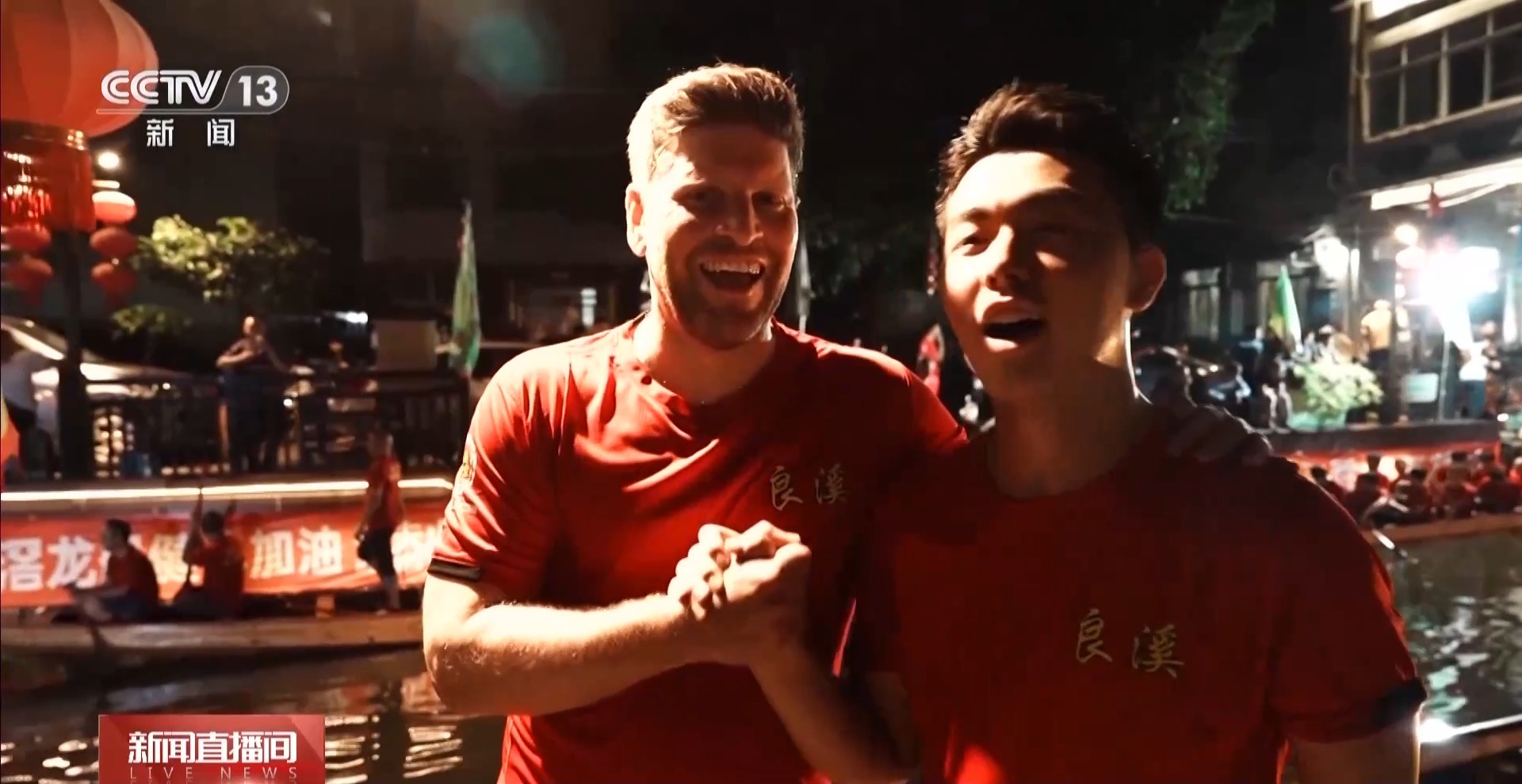 晚上8點(diǎn),當(dāng)記者來到佛山南海區(qū)的疊北社區(qū)時(shí),河道兩邊已經(jīng)圍滿了觀看夜訓(xùn)的村民和游客。伴隨著鏗鏘鼓點(diǎn)和陣陣歡呼,隊(duì)員們揮臂劃槳、破水前行,一艘艘龍舟在河道中穿梭、漂移、折返。在激烈的競(jìng)技中,一個(gè)金發(fā)碧眼的外國面孔正和中國“扒仔”們一起奮力劃行。