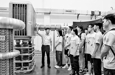中國(guó)原子能科學(xué)研究院研究員在瑞昌核物理應(yīng)用研究院向?qū)W生們講解我國(guó)自主研發(fā)的AMS加速器。魏東升攝/光明圖片