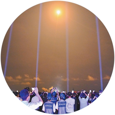 “5,4,3,2,1”——火箭的火焰照亮夜幕,平臺的光束射向天際……19時50分,火箭發(fā)射升空,游客們舉著手機記錄,現(xiàn)場歡呼聲陣陣?!昂芘d奮、很震撼,感覺一伸手就能‘抓’到火箭。”延鈺菲說。