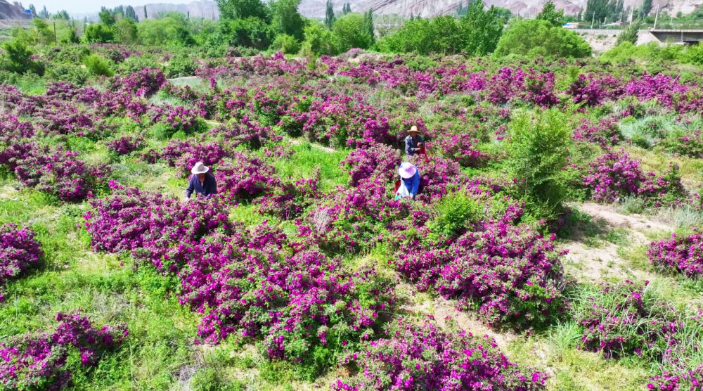 苦水鎮(zhèn)人在花田里采摘玫瑰。新華社發(fā)
