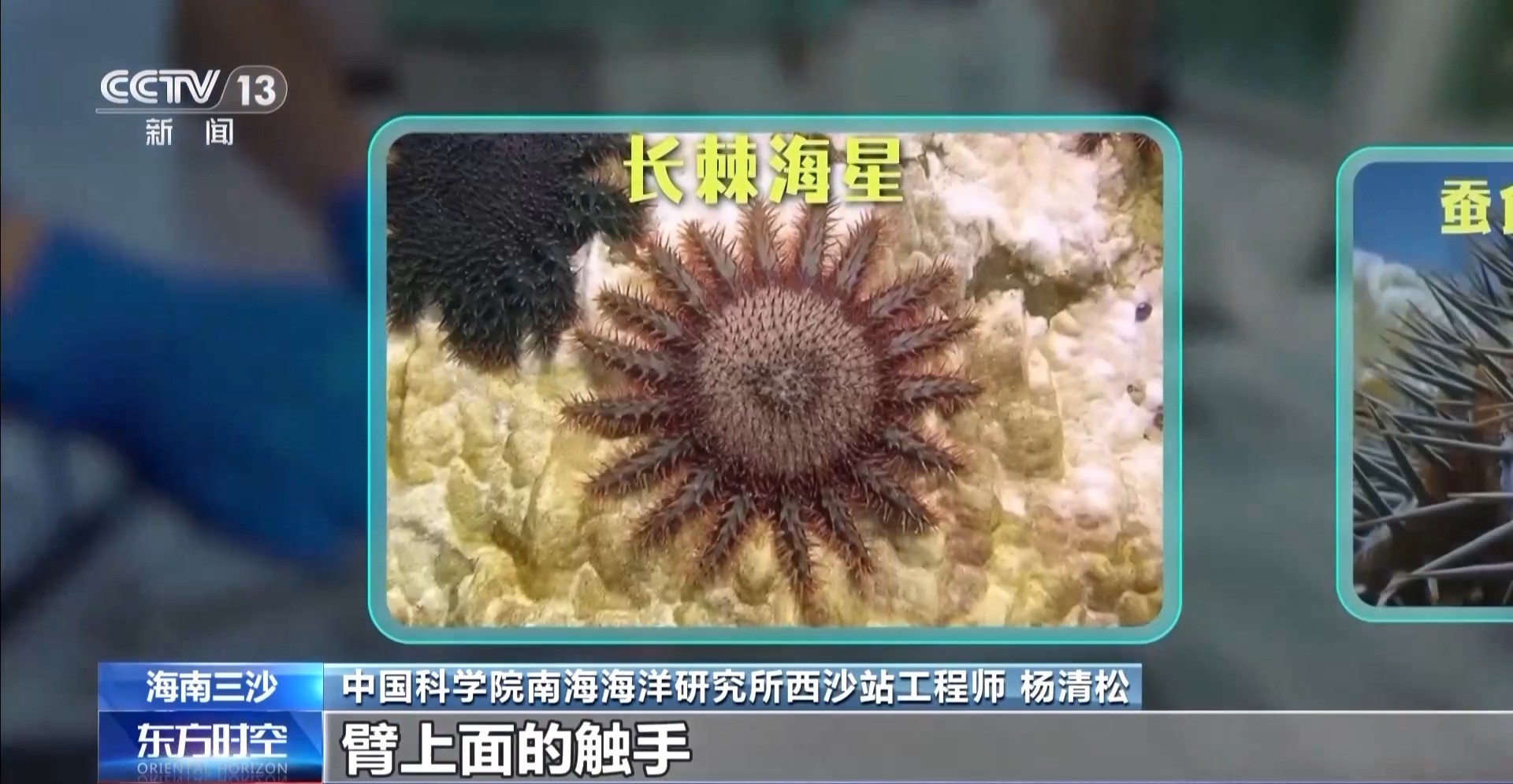 中國科學(xué)院南海海洋研究所西沙站工程師 楊清松:這個(gè)海星有十幾只臂,臂上面的觸手,它會(huì)伸出來,它把它的胃整個(gè)排出來,把珊瑚包裹住,把整個(gè)珊瑚的組織給消化掉,只剩骨骼了,這個(gè)跟珊瑚白化不一樣,吃掉就沒辦法了。