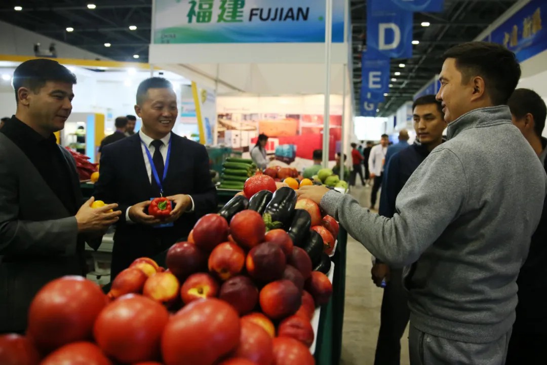 當(dāng)?shù)貢r(shí)間2024年8月23日,第十九屆哈薩克斯坦—中國(guó)商品展覽會(huì)在哈薩克斯坦首都阿斯塔納世博園國(guó)際展覽中心開(kāi)幕。圖為來(lái)自中國(guó)的精品果蔬吸引不少觀眾前來(lái)問(wèn)詢。 中新社記者 單璐 攝