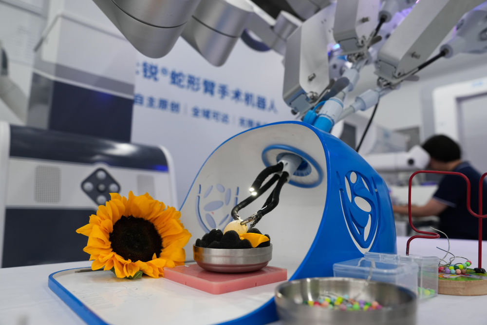 6月18日,工作人員在使用術(shù)銳蛇形臂手術(shù)機器人進行剝生鵪鶉蛋殼展示。新華社記者鄭煥松 攝