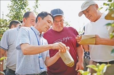 近日,2025年首期中國(guó)—中亞五國(guó)職業(yè)農(nóng)民培訓(xùn)班在陜西渭南開班。圖為學(xué)員們?cè)谖鞅鞭r(nóng)林科技大學(xué)蘋果試驗(yàn)站了解蘋果套袋知識(shí)。