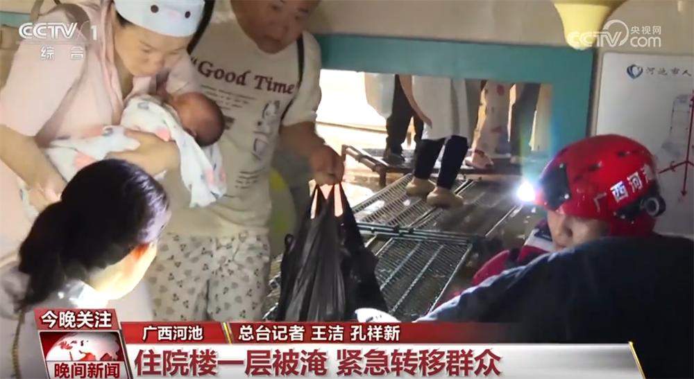 這兩天,廣西河池多地遭遇強降雨天氣。河池市人民醫(yī)院住院部大樓一層出現(xiàn)嚴(yán)重積水,幾百名住院的病人和陪護(hù)家屬需要轉(zhuǎn)移,救援人員迅速行動起來。