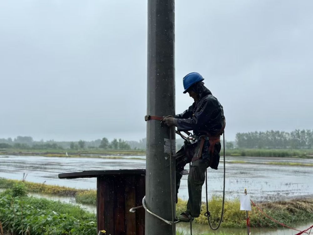 21日上午,暴雨如注,湖北荊州石首市大垸鎮(zhèn)北碾村的田野在雨幕中愈發(fā)朦朧?!坝陝葸€在加大,必須趕在積水漫過田埂前完成架線!”在北碾村東河頭八組,電工祁劍的呼喊聲穿透雨幕。