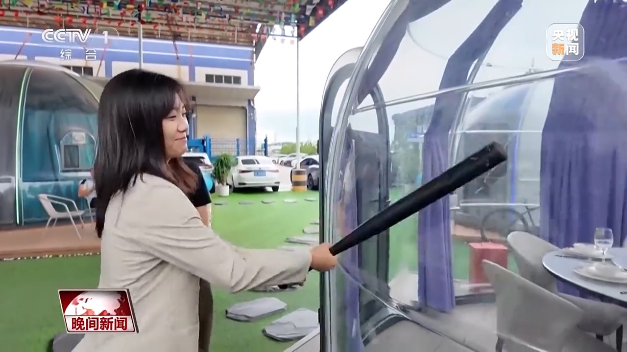 “星空房”的墻面材質(zhì)只有4毫米厚。為了驗(yàn)證房屋強(qiáng)度,企業(yè)負(fù)責(zé)人請(qǐng)記者現(xiàn)場(chǎng)用鐵棒猛擊外墻。幾輪擊打過(guò)后,墻面毫發(fā)無(wú)傷,沒(méi)有出現(xiàn)任何裂痕。