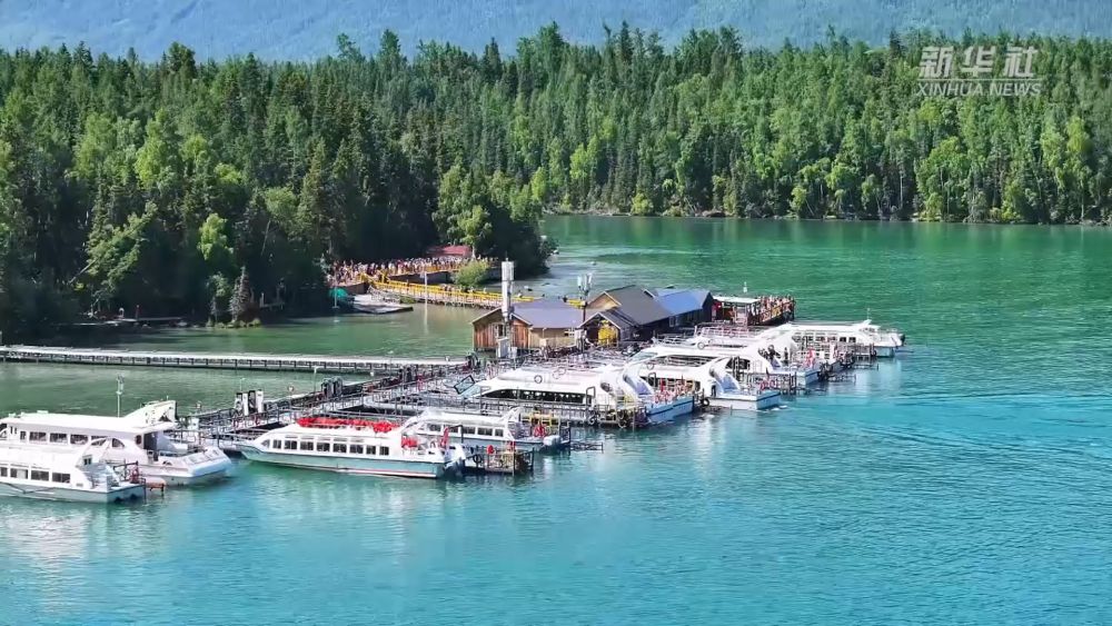 在碧波蕩漾的新疆喀納斯湖里,一艘艘全電觀光游船正載著游客欣賞著這里獨特的湖光山色。