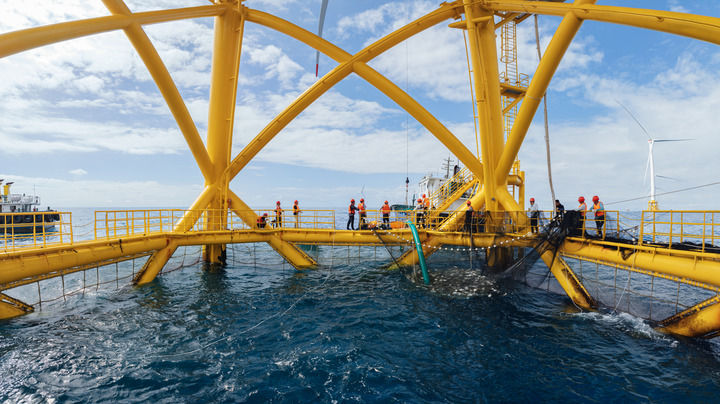 圖為位于廣東陽(yáng)江我國(guó)自主研發(fā)的風(fēng)漁一體化智能裝備“明漁一號(hào)”迎來(lái)首批漁獲。受訪企業(yè)供圖