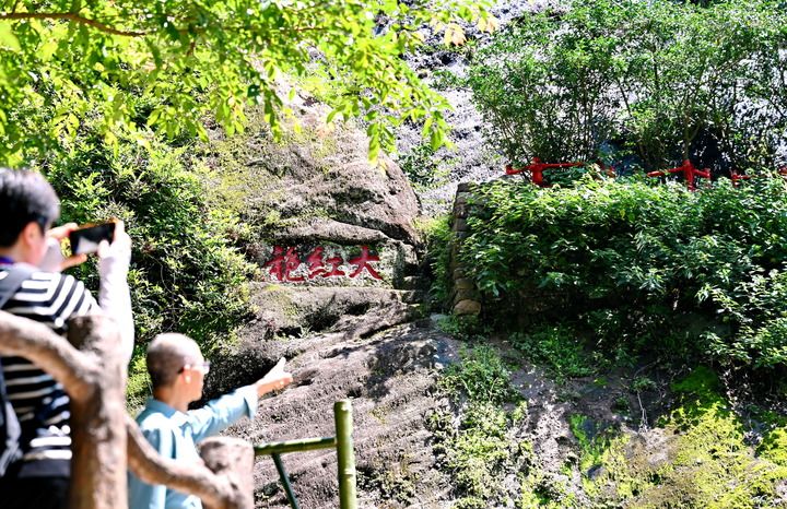 6月25日,游客在福建武夷山風景名勝區(qū)參觀生長在武夷山九龍窠高巖峭壁上的大紅袍茶樹母株。