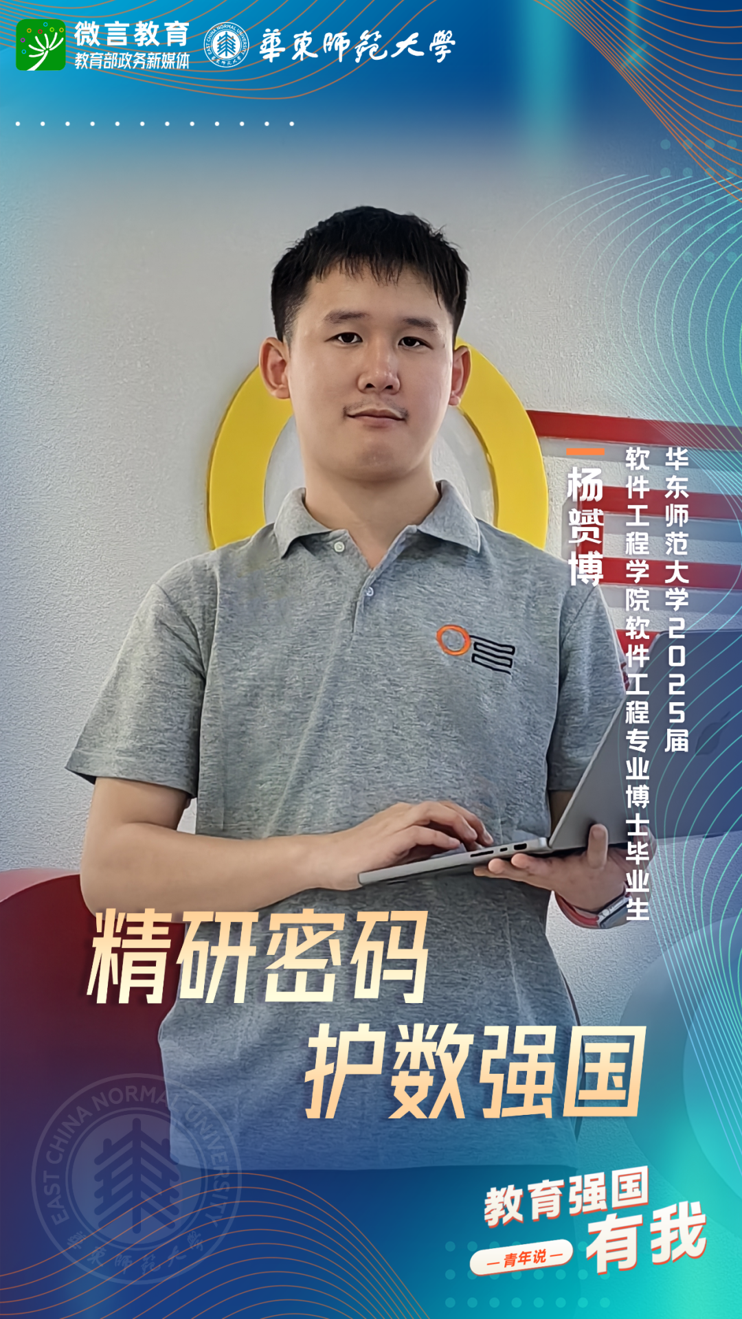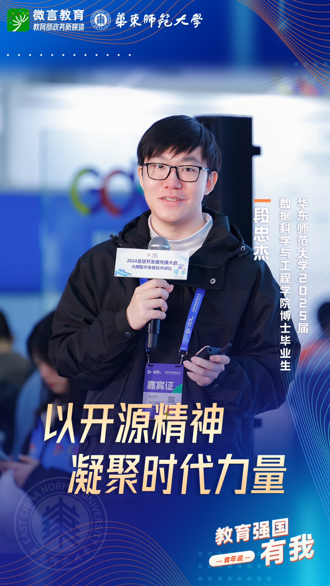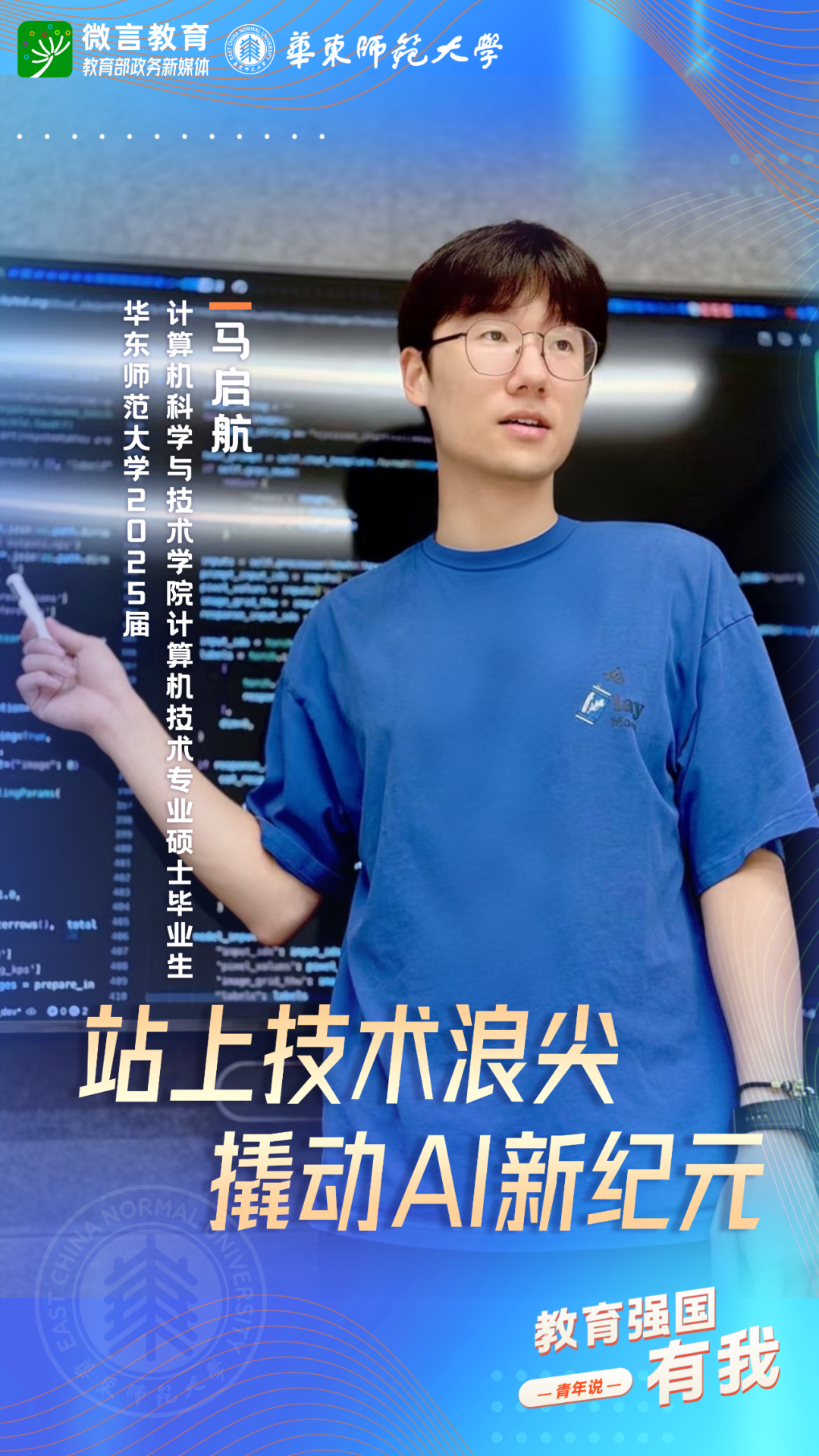 習(xí)近平總書記強調(diào),希望廣大青年堅定理想信念,厚植家國情懷,練就過硬本領(lǐng),發(fā)揚奮斗精神,到祖國和人民最需要的地方發(fā)光發(fā)熱,為中國式現(xiàn)代化建設(shè)貢獻青春力量。教育強國建設(shè),青年何為?教育部政務(wù)新媒體推出“教育強國,有我!”網(wǎng)絡(luò)主題宣傳活動之“青年說(報國篇)”系列,展現(xiàn)青年學(xué)子將個人理想融入國家發(fā)展的青春擔(dān)當(dāng)。今天,跟教育小微通過1個視頻和1組海報,一起來看華東師范大學(xué)學(xué)子如何“向新而行”——