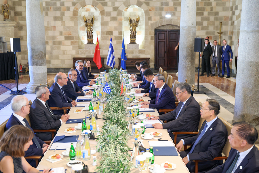 當?shù)貢r間7月4日下午,國務(wù)院總理李強在希臘羅德島會見希臘副總理哈齊達基斯。