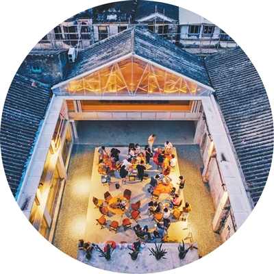 2015年,李繼津和合伙人看上了塘口舊墟兩處建筑,“原先是舊糧倉周邊的五金廠、鐘表廠,雖然建筑很舊,但很有設計感,而且舊墟與周圍的村子距離很近,有做社區(qū)改造的潛力?!闭f干就干,舊工廠逐漸被改造為時尚的青年社區(qū)空間——“塘口空間”,餐廳、青年旅舍、劇場、活動空間等一應俱全,舊工廠里原有的一些制造機械作為歷史記憶的“載體”也被保留下來?!敖ㄖ荒苊撾x鄉(xiāng)村?!崩罾^津說。