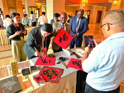 與會(huì)外國嘉賓在會(huì)議間隙體驗(yàn)寫福字。光明日報(bào)記者 楊逸夫攝/光明圖片