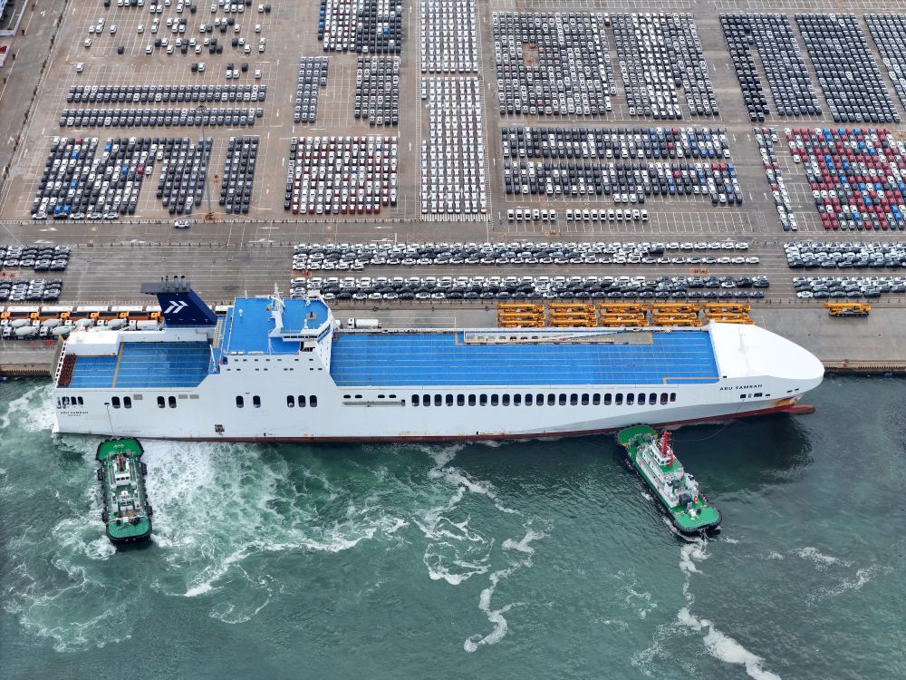 6月29日,汽車運(yùn)輸船??可綎|港口煙臺港,準(zhǔn)備裝運(yùn)出口汽車(無人機(jī)照片)。新華社發(fā)(唐克 攝)