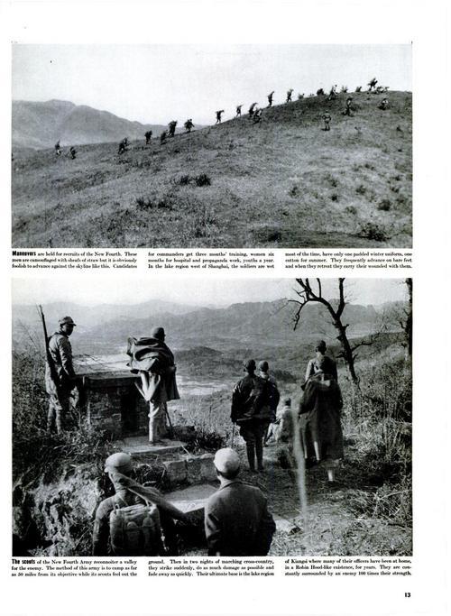 這是1939年7月出版的美國《生活》雜志第13頁影印件,展示了史沫特萊拍攝的新四軍訓(xùn)練和偵察的一些畫面。上圖:新四軍的新兵們開展戰(zhàn)術(shù)訓(xùn)練;下圖:新四軍的偵察小隊(duì)正在山谷中執(zhí)行敵情偵察任務(wù)。