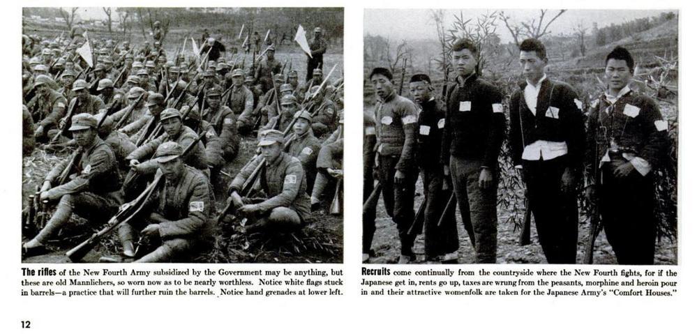 這是1939年7月出版的美國《生活》雜志第12頁影印件局部,展示了史沫特萊拍攝的新四軍的一些畫面。左圖:新四軍的裝備較為簡陋;右圖:新四軍從作戰(zhàn)的農(nóng)村地區(qū)招募新兵。
