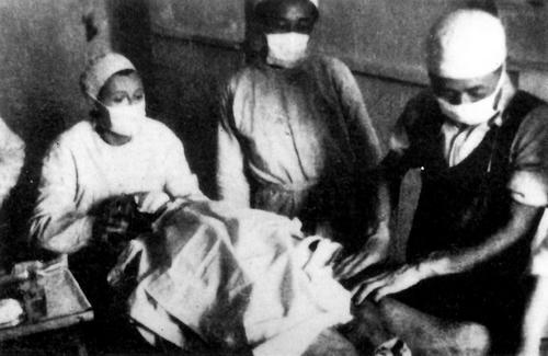1939年,在安徽省宣城市涇縣云嶺鎮(zhèn),新四軍軍醫(yī)處醫(yī)務(wù)主任宮乃泉(右一)與加拿大護(hù)士瓊·尤恩(左一)等為戰(zhàn)士做手術(shù),照片由新四軍軍長葉挺拍攝。