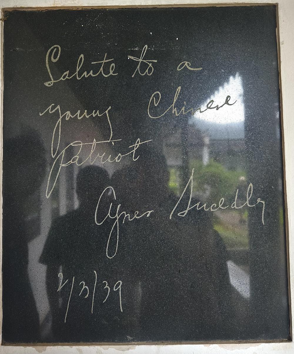 1939年史沫特萊寫給新四軍教導(dǎo)總隊(duì)學(xué)員葛涼的一句話語,如今也被鐫刻在石碑之上——“Salute to a young Chinese patriot(向一位年輕的中國愛國者致敬)”。