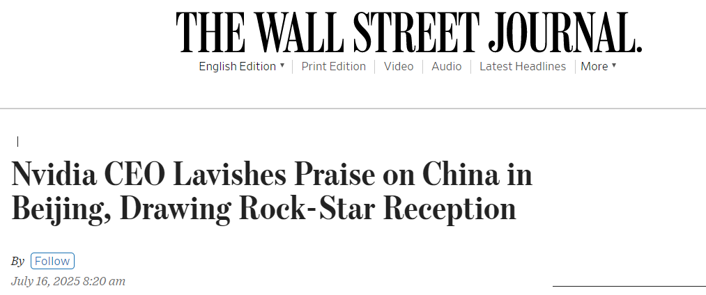美國(guó)《華爾街日?qǐng)?bào)》報(bào)道稱,市值達(dá)4萬億美元的AI芯片公司掌門人黃仁勛在訪問北京期間多次表達(dá)對(duì)中國(guó)的贊賞,盛贊中國(guó)的科技進(jìn)步。