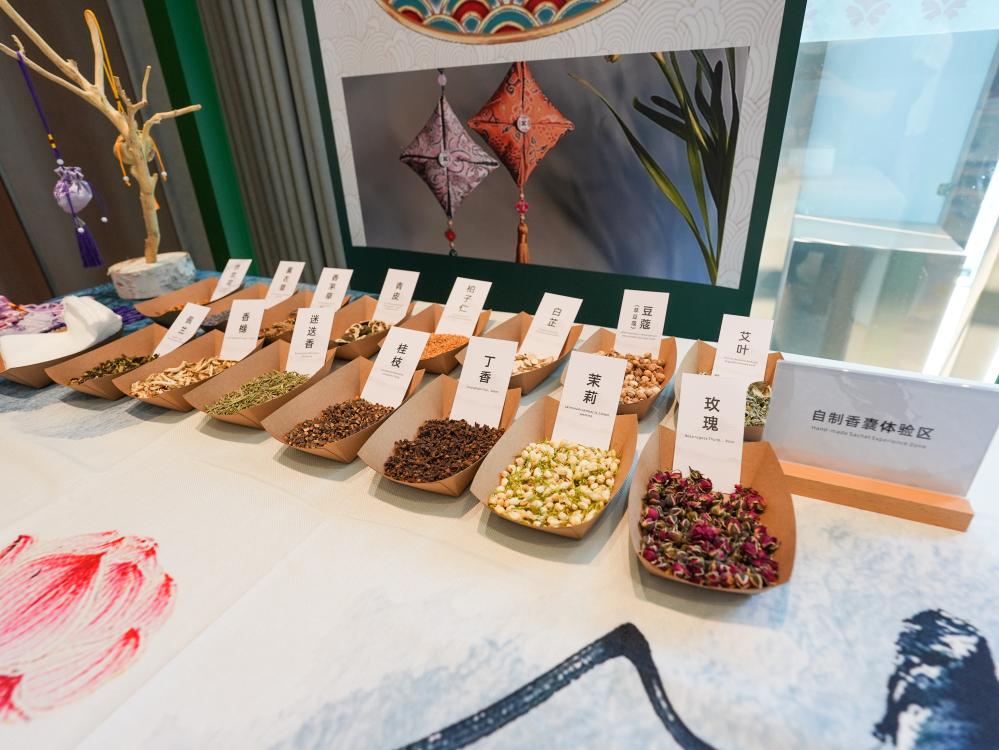 8月3日,在成都世運(yùn)會運(yùn)動(dòng)員村A區(qū)中醫(yī)藥體驗(yàn)館拍攝的自制香囊體驗(yàn)區(qū)。新華社記者 王曦 攝