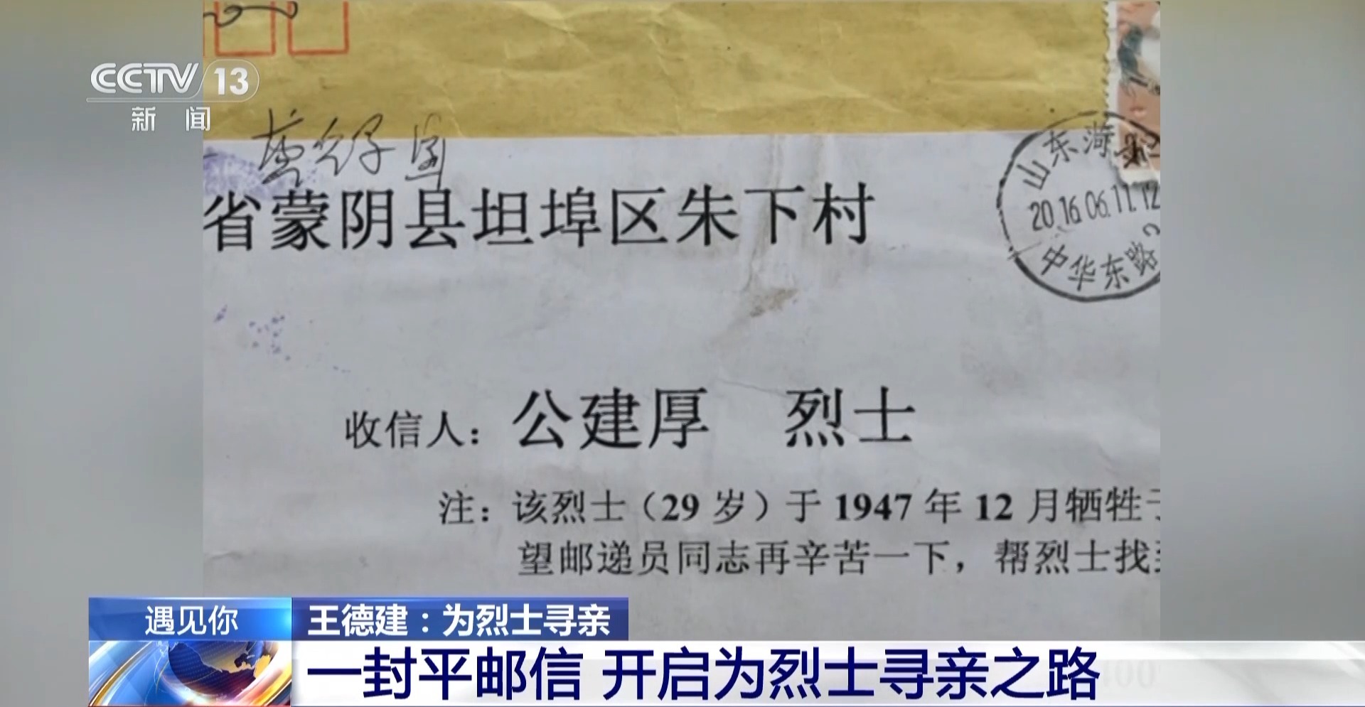 信件來自“菏澤市張和莊烈士陵園”,寄往“山東省蒙陰縣坦埠區(qū)朱下村”,收信人為“公建厚”烈士,信件上注有如下信息“該烈士(29歲)于1947年12月犧牲于菏澤戰(zhàn)役,望郵遞員同志再辛苦一下,幫烈士找到家。”