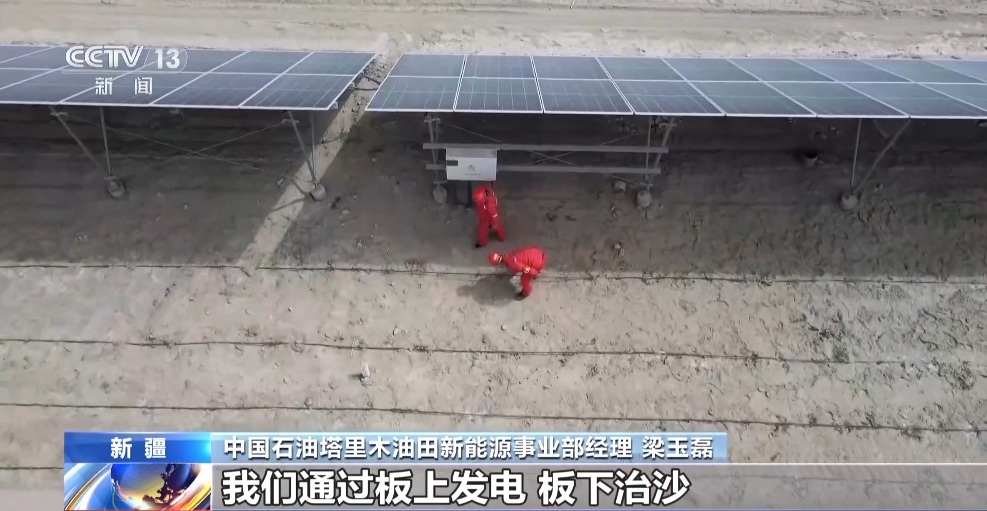 中國石油塔里木油田新能源事業(yè)部經(jīng)理 梁玉磊:我們通過板上發(fā)電、板下治沙,建設(shè)光伏方陣32個(gè),固沙面積達(dá)到4000畝。有效改變了小環(huán)境風(fēng)速,形成“發(fā)電-固沙-惠民”一體模式。