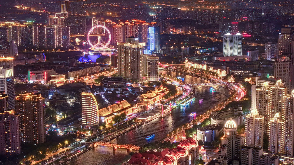 夜幕降臨,海河兩岸璀璨絢麗、千變?nèi)f化:高層建筑披上燈光外衣,勾勒出兩岸高低協(xié)調(diào)、錯落有致的天際線;跨越在海河兩岸的座座橋梁,如長虹臥波、玉帶蜿蜒;游人排隊乘坐永樂橋“天津之眼”摩天輪,座艙升至最高處,可將大半座城市的繁華盡收眼底……