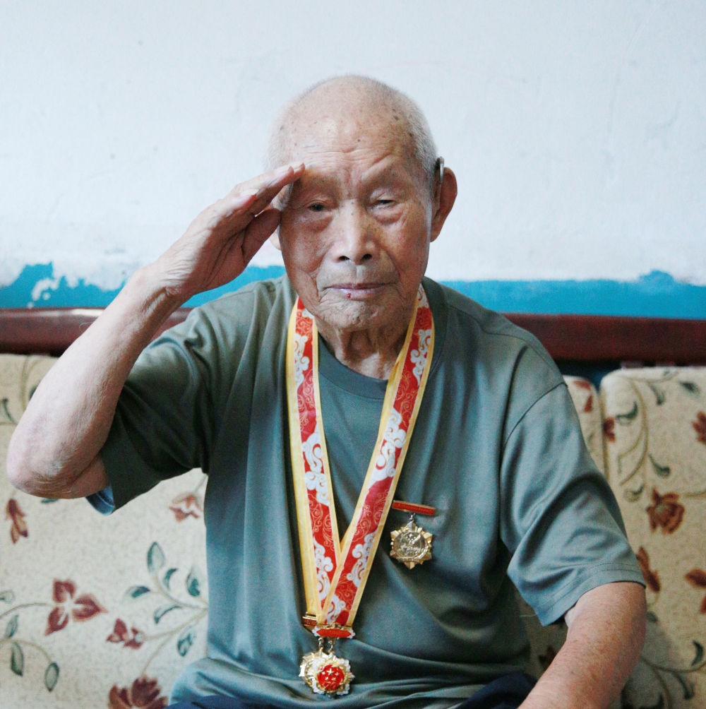 7月24日,96歲的抗日老兵臧海龍在家中展示軍禮。新華社記者 肖磊濤 攝