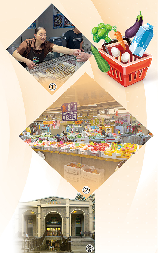 圖②:位于合景·摩方購(gòu)物中心內(nèi)的新崇文門(mén)菜市場(chǎng),貨架上各類(lèi)水果、蔬菜琳瑯滿(mǎn)目。本報(bào)記者 李君強(qiáng)攝