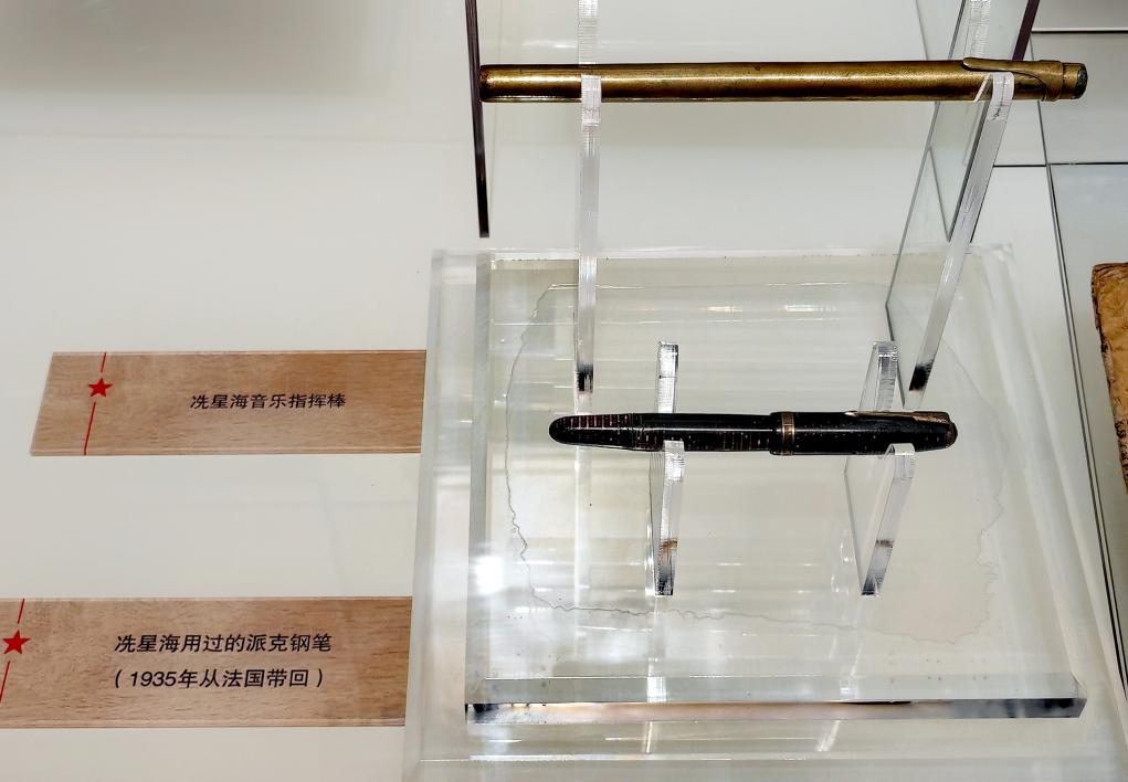 延安文藝紀念館展出的冼星海使用過的指揮棒和鋼筆。新華社記者 孫正好 攝