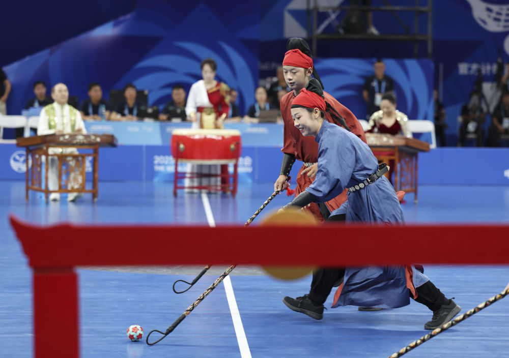 世運(yùn)會不僅是競技的賽場,更是文明互鑒的窗口。8月6日,軟式曲棍球項(xiàng)目開賽。正式比賽之前,一場別開生面的“比賽”率先上演。循著鼓點(diǎn)、琴聲,演員們身著唐裝球衣競逐竹編彩球,一場金堂非遺步打球表演,將現(xiàn)場觀眾帶回到盛唐場景。