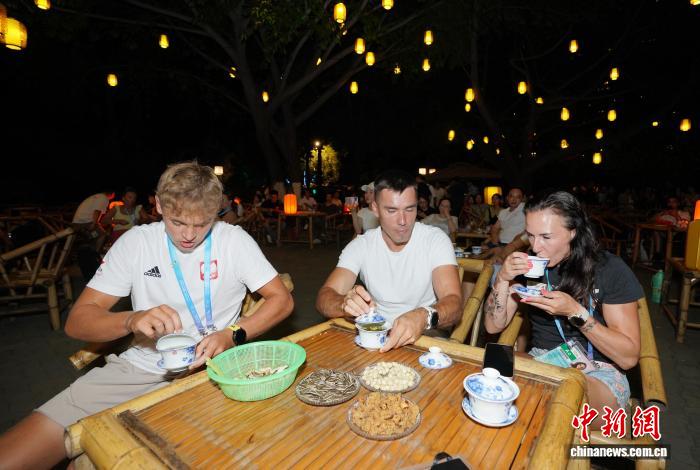 8月6日晚,成都世運(yùn)會(huì)外籍運(yùn)動(dòng)員等在成都望江樓公園品成都蓋碗茶。 中新社記者 安源 攝