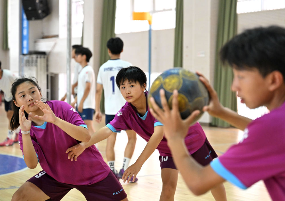 鄭州市第七十六中學荷球隊球員練習傳接球。新華社記者 李嘉南 攝