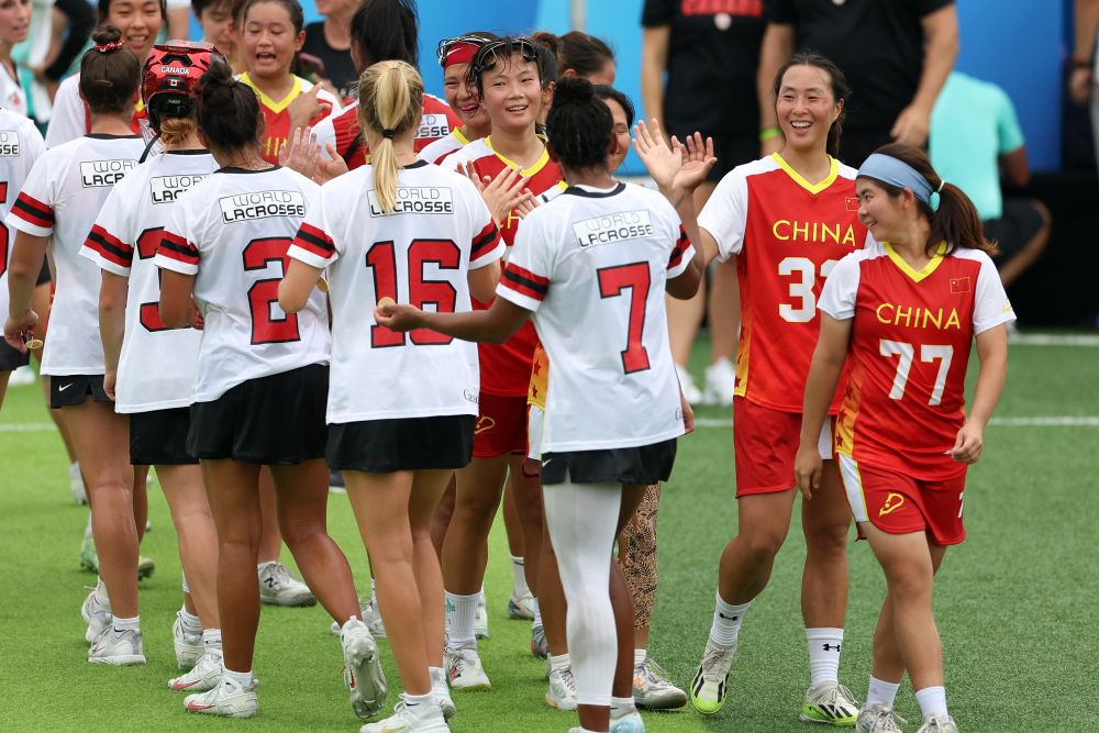 8月9日,中國棍網球隊球員與加拿大隊球員賽后擊掌致意。新華社記者 陳斌 攝