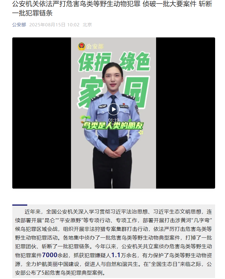 近年來(lái),全國(guó)公安機(jī)關(guān)深入學(xué)習(xí)貫徹習(xí)近平法治思想、習(xí)近平生態(tài)文明思想,連續(xù)部署開(kāi)展“昆侖”“平安原野”等專(zhuān)項(xiàng)行動(dòng)、專(zhuān)項(xiàng)工作,部署開(kāi)展打擊涉黃河“幾字彎”候鳥(niǎo)犯罪區(qū)域會(huì)戰(zhàn),組織開(kāi)展非法狩獵專(zhuān)案集群打擊行動(dòng),依法嚴(yán)厲打擊危害鳥(niǎo)類(lèi)等野生動(dòng)物犯罪活動(dòng)。各地集中偵辦了一批危害鳥(niǎo)類(lèi)等野生動(dòng)物典型案件,打掉了一批犯罪團(tuán)伙、斬?cái)嗔艘慌缸镦湕l。今年以來(lái),公安機(jī)關(guān)共立案?jìng)赊k危害鳥(niǎo)類(lèi)等野生動(dòng)物犯罪案件7000余起,抓獲犯罪嫌疑人1.1萬(wàn)余名,有力保護(hù)了鳥(niǎo)類(lèi)等野生動(dòng)物資源,全力護(hù)航美麗中國(guó)建設(shè),促進(jìn)人與自然和諧共生。在“全國(guó)生態(tài)日”來(lái)臨之際,公安部公布了5起危害鳥(niǎo)類(lèi)犯罪典型案例。