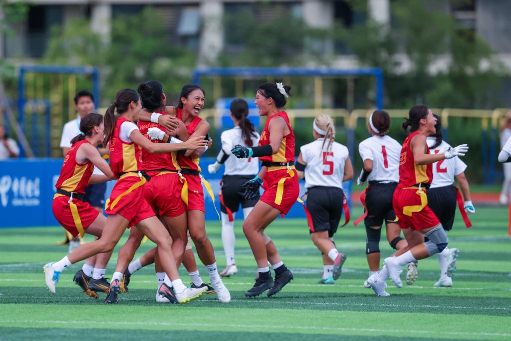 8月16日,中國隊球員在賽后慶祝勝利。當日,在2025年成都世運會腰旗橄欖球女子5-8名安慰賽半決賽中,中國隊戰(zhàn)勝日本隊。新華社記者 魏翔 攝