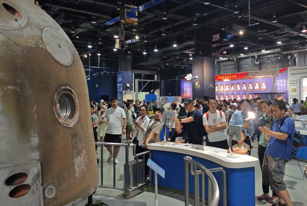 暑期的中國(guó)科技館人頭攢動(dòng),“神舟一號(hào)”返回艙實(shí)物吸引游客圍觀。(中國(guó)科技館供圖)