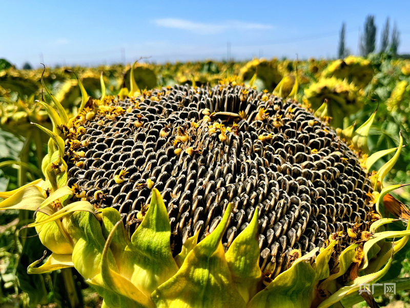 初秋時(shí)節(jié),內(nèi)蒙古阿拉善盟阿拉善左旗溫都爾勒?qǐng)D鎮(zhèn)巴潤(rùn)霍德嘎查的1.3萬(wàn)畝葵花迎來(lái)豐收。田間地頭,農(nóng)戶們正忙碌地收割、插盤、晾曬,一片喜人景象。沉甸甸的葵花盤壓彎枝頭,顆粒飽滿、色澤金黃,不僅映襯出豐收的喜悅,更照亮了當(dāng)?shù)厝罕娫鍪罩赂坏摹敖鹕贰薄?/p>