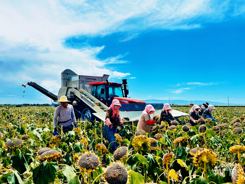 藍(lán)天白云下,農(nóng)民們與農(nóng)機(jī)協(xié)同,在向日葵田忙碌收獲(央廣網(wǎng)發(fā) 馬曉甜 攝)