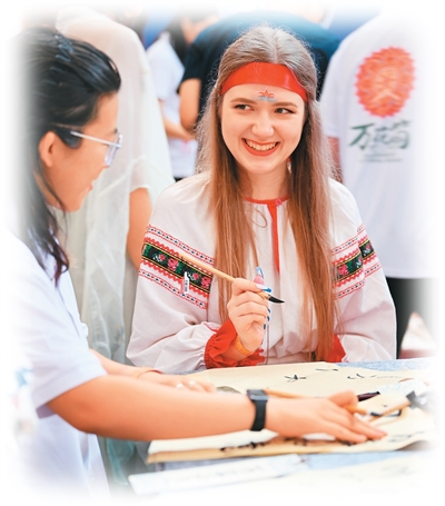 8月6日,“上合之約·絲路津彩”上合國(guó)家青年學(xué)生“萬(wàn)花筒”文化市集在天津舉行。圖為青年學(xué)生體驗(yàn)書(shū)法。