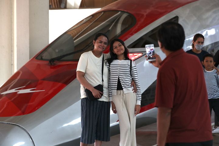 6月19日,在印度尼西亞雅加達(dá)哈利姆站站臺,兩名乘客與雅萬高鐵高速動(dòng)車組列車合影。 新華社記者 岑云鵬 攝