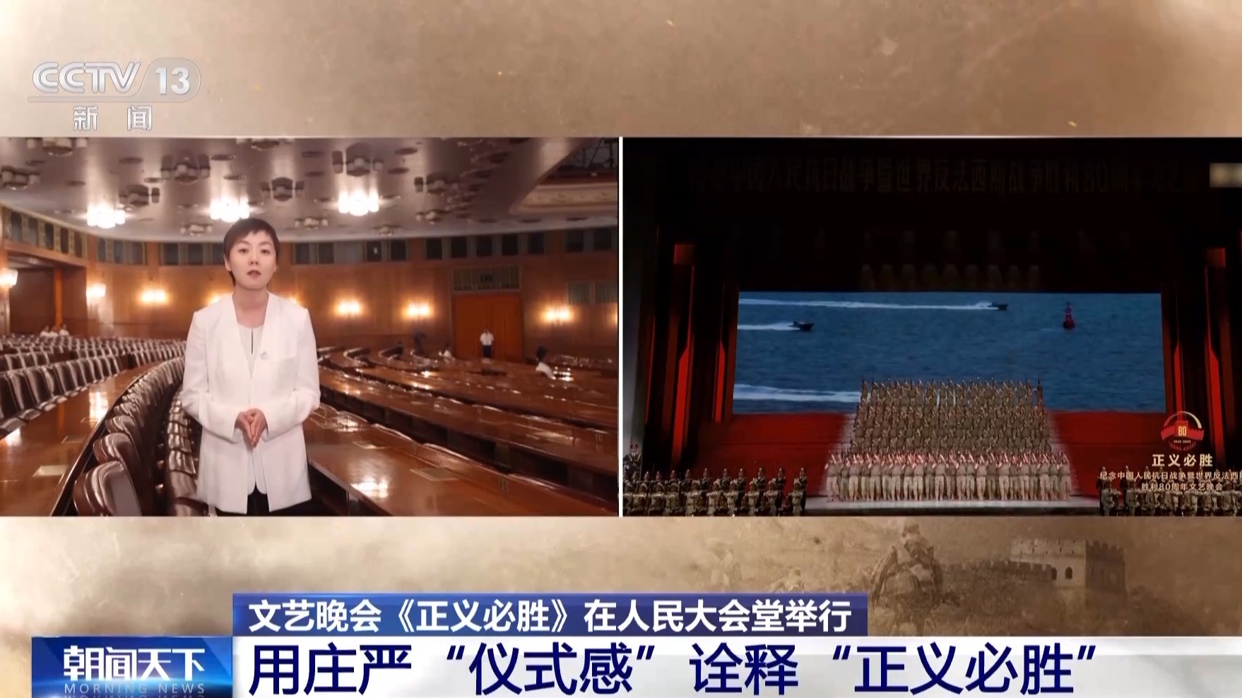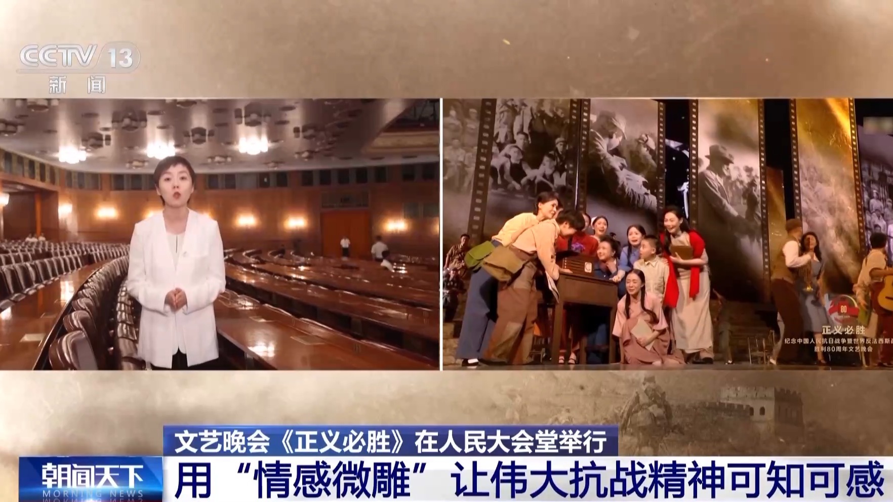 總臺央視記者 曹巖:從八月起我們一直在現(xiàn)場跟蹤記錄抗戰(zhàn)勝利80周年紀(jì)念晚會的排練,我個人覺得這場晚會最大的特征,就是在里面我們看到的不是一個又一個的獨(dú)立節(jié)目,而是一整部的情景史詩劇。