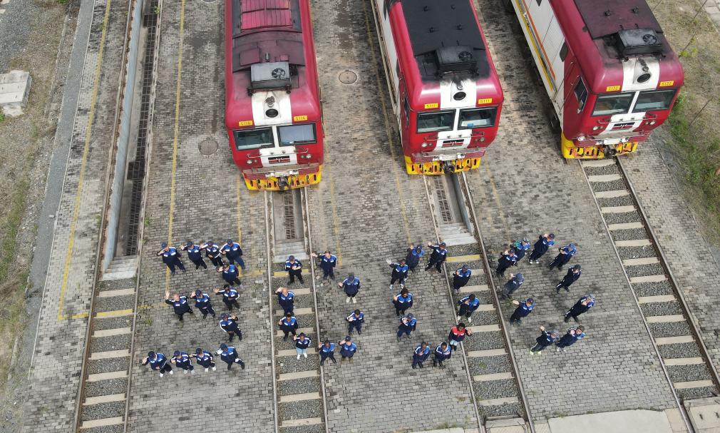 2025年8月19日,在肯尼亞內(nèi)羅畢非洲之星鐵路運營有限責(zé)任公司機(jī)務(wù)運轉(zhuǎn)整備場,中肯兩國鐵路工作者在機(jī)車前站列并組成“3000”字樣,以紀(jì)念蒙內(nèi)鐵路實現(xiàn)安全運營3000天(無人機(jī)照片)。新華社記者 楊光 攝