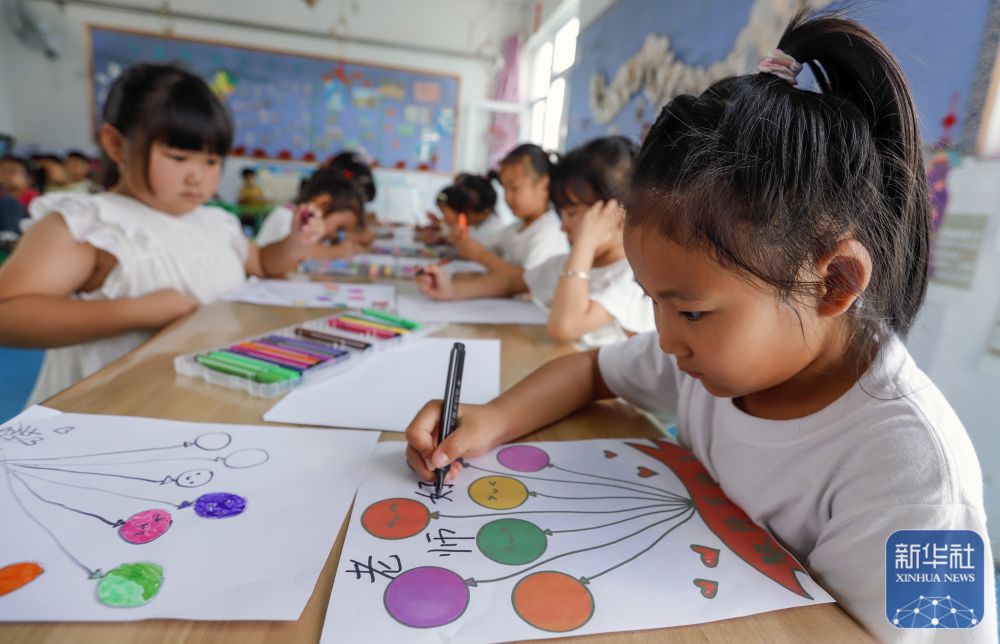 9月9日,河北省遵化市遵化鎮(zhèn)南關(guān)幼兒園的小朋友在繪制美術(shù)作品感念師恩。新華社發(fā)(劉滿倉攝)