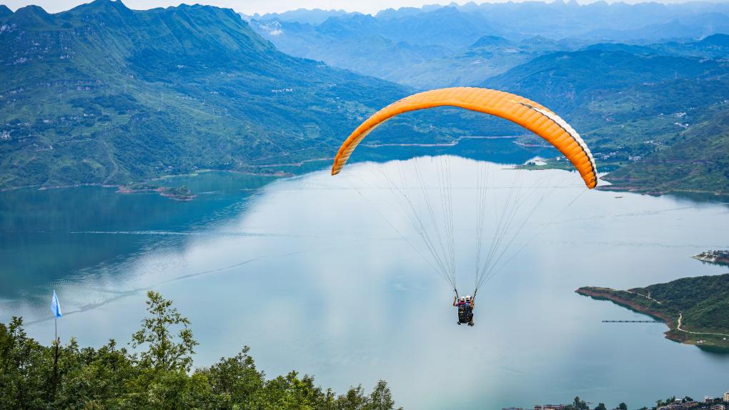 7月9日,游客在教練的陪同下體驗(yàn)低空滑翔飛行?;鑲氵@一低空旅游項(xiàng)目成為了貴州省六盤水市眾多游客的新選擇。新華社記者 陶亮 攝