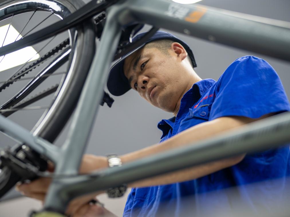 7月16日,在吉林化纖集團(tuán)復(fù)材體育休閑裝備產(chǎn)業(yè)園,工人組裝碳纖維自行車車架。新華社記者 邵澤東 攝