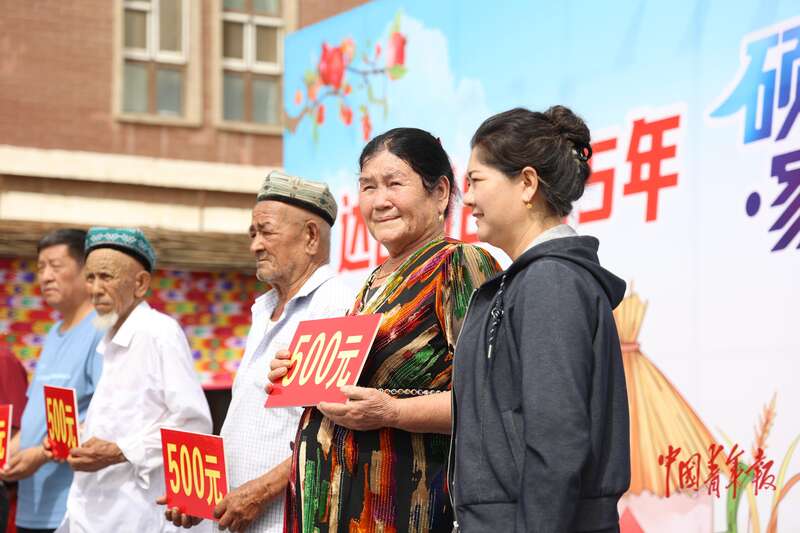 9月9日,新疆巴州尉犁縣興平鎮(zhèn)達(dá)西村,一場慶豐收活動(dòng)上,達(dá)西村黨委書記夏提古麗·熱合曼(右一)代表村集體向該村長者發(fā)放慰問金。通過棉花種植、文化旅游等,2024年達(dá)西村集體收入達(dá)230.55萬元。中青報(bào)·中青網(wǎng)記者 王鑫昕/攝